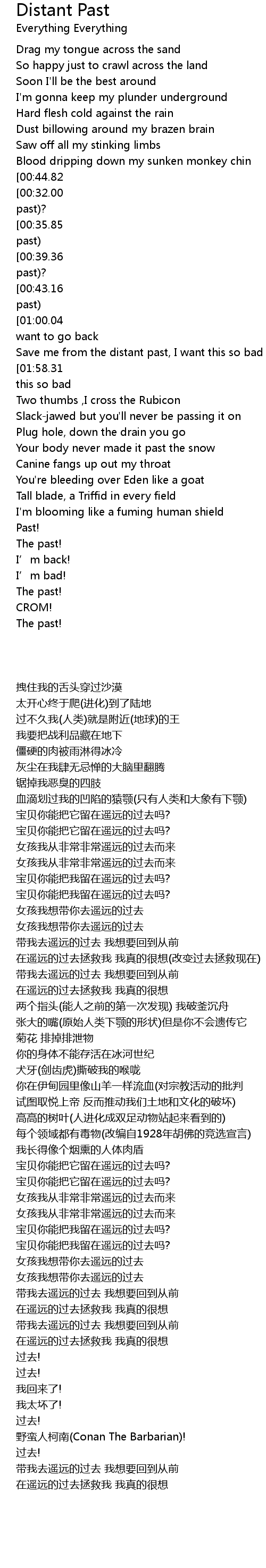 | [01:06.93][01:58.31][02:13.14][03:16.40] | Save me from the distant past, I want this so bad |