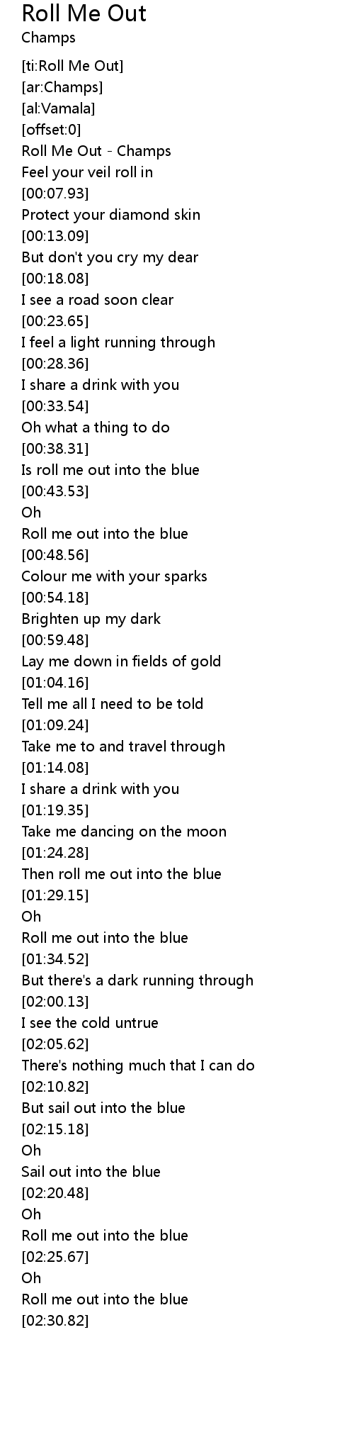 | [00:00.07] | Roll Me Out - Champs |