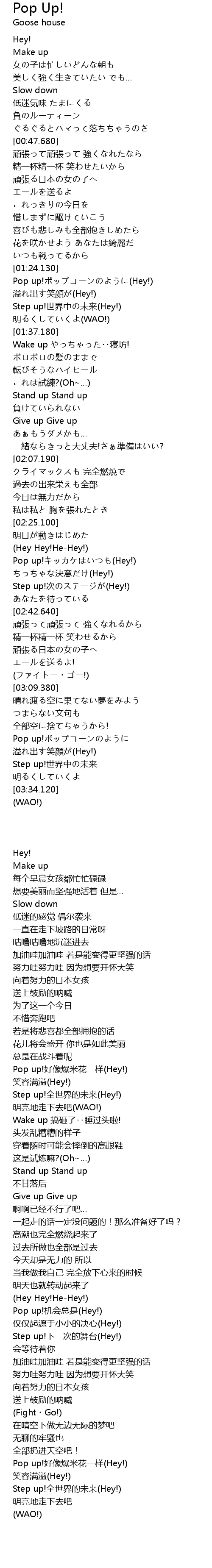 | [02:30.960] | Pop up!キッカケはいつも(Hey!) |