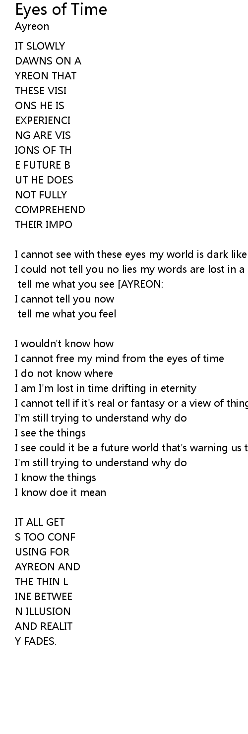 I see the world through the eyes of time [VILLAGERS:] tell me what you feel [AYREON:]