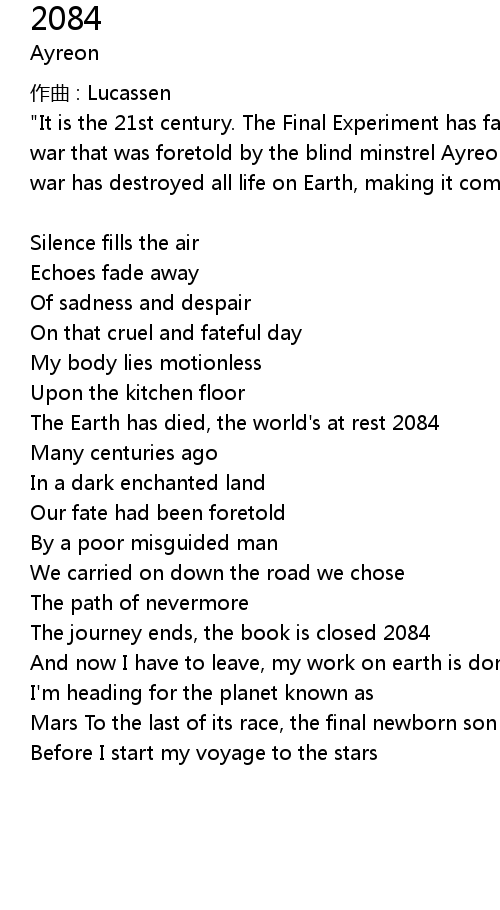 | The Earth has died, the world's at rest 2084 | |