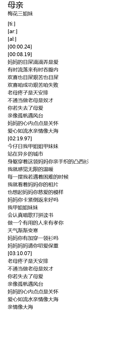 | [03:05.71] | 妈妈妈妈请你叨爱保重 |