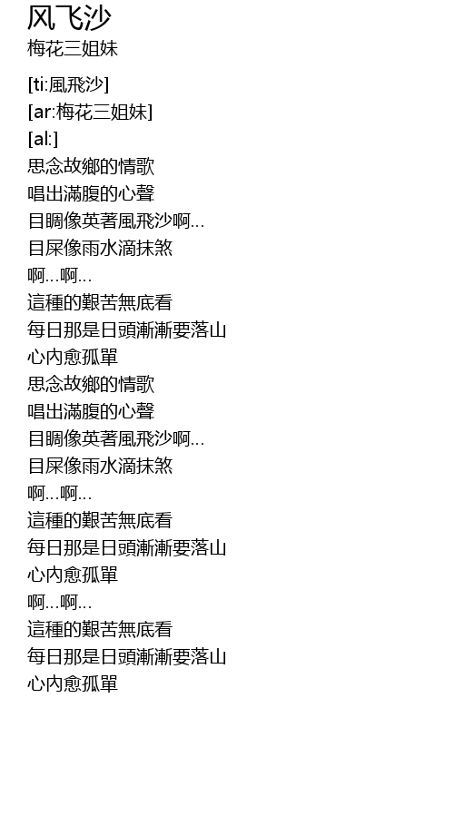 | [00:33.50] | 目睭像英著風飛沙啊… |