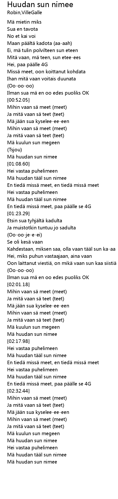 | [01:10.39] | Mä huudan tääl sun nimee |