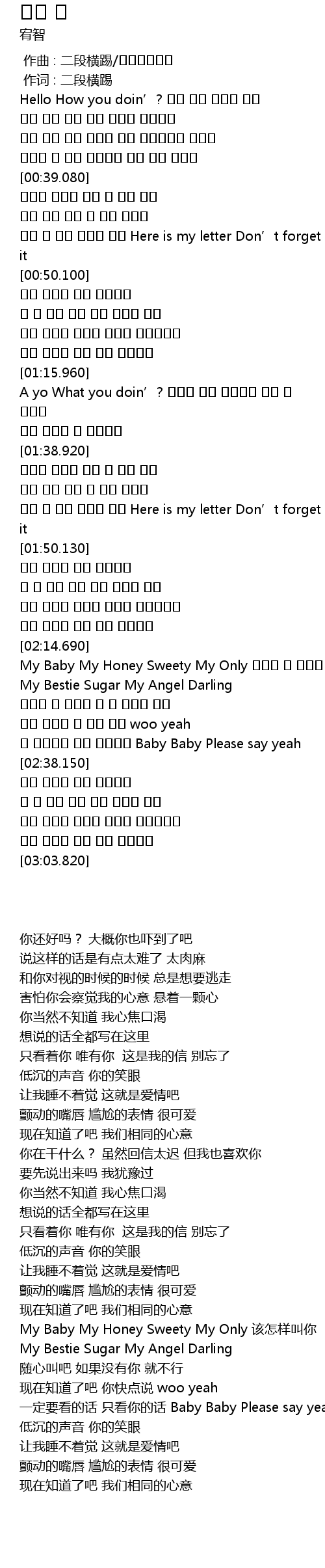 | [02:32.540] | 꼭 봐줬으면 너만 봐줬으면 Baby Baby Please say yeah |