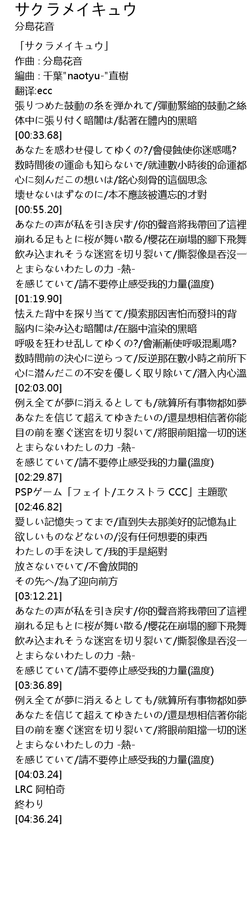 | [02:33.82] | PSPゲーム「フェイト/エクストラ CCC」主題歌 |