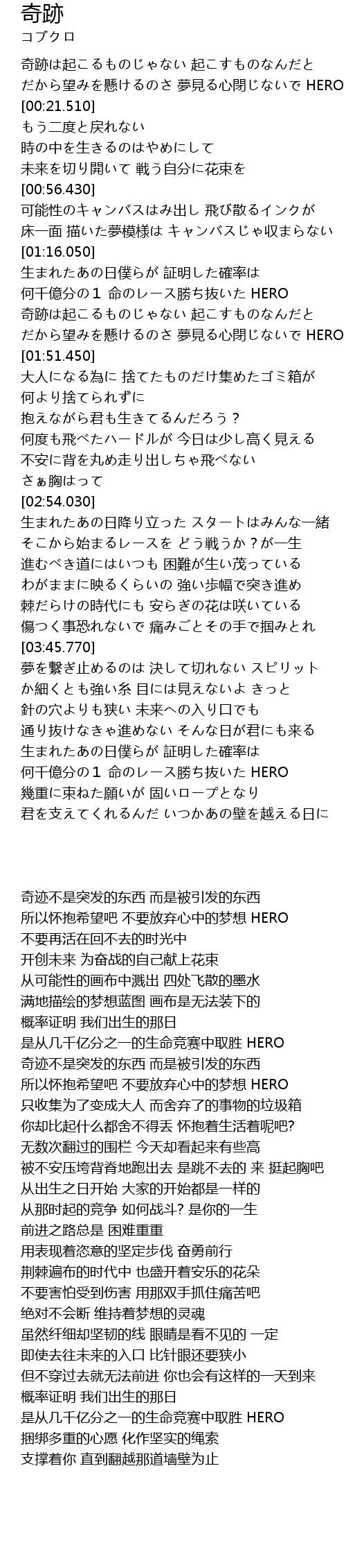 | [00:09.870] | だから望みを懸けるのさ 夢見る心閉じないで HERO |