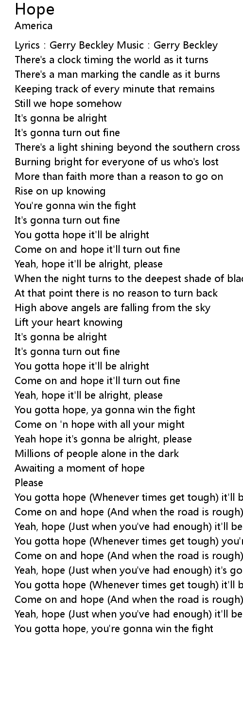 | You gotta hope Whenever times get tough it' ll be alright | |