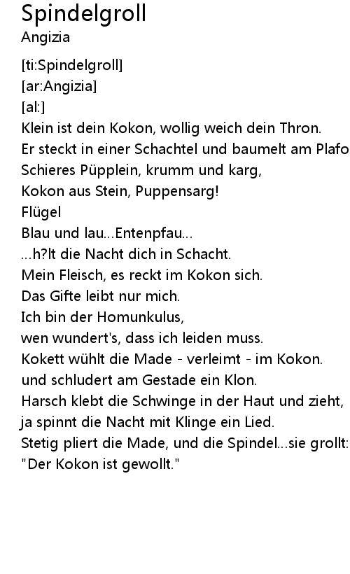 | [01:41.24] | Kokett wühlt die Made - verleimt - im Kokon. |