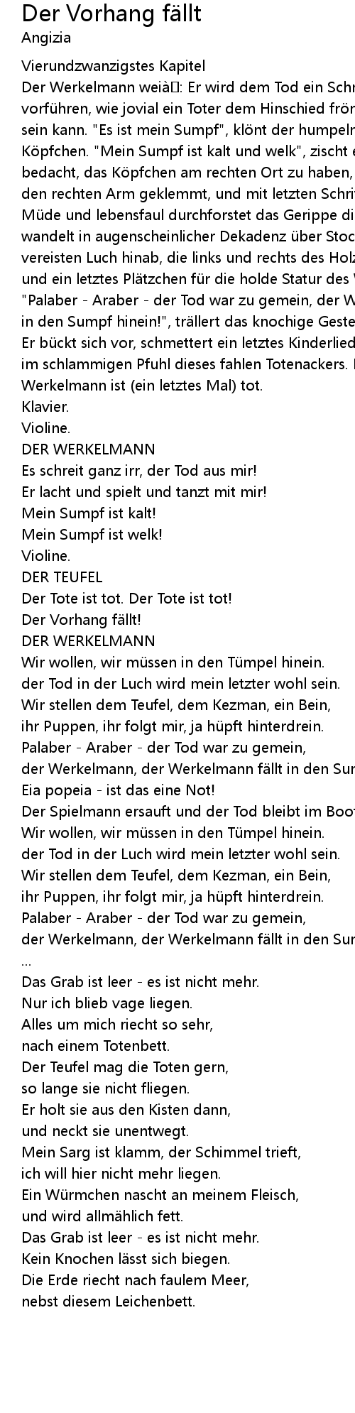 | Der Werkelmann weia: Er wird dem Tod ein Schnippchen schlagen. Er wird ihm vorfü hren, wie jovial ein Toter dem Hinschied fr nen und wie tot ein Toter sein kann. " Es ist mein Sumpf", kl nt der humpelnde Werkelmann aus seinem losen K pfchen. " Mein Sumpf ist kalt und welk", zischt er vor sich hin, stets bedacht, das K pfchen am rechten Ort zu haben, seine Marionette August unter den rechten Arm geklemmt, und mit letzten Schritten zu Kezmans Pfuhl zu waten. Mü de und lebensfaul durchforstet das Gerippe die Sarg hohe Schneedecke und wandelt in augenscheinlicher Dekadenz ü ber Stock und Stein zum Ufer der halb vereisten Luch hinab, die links und rechts des Holzsteges nicht zufrieren wollte und ein letztes Pl tzchen fü r die holde Statur des Werkelmannes bereit hielt. " Palaber Araber der Tod war zu gemein, der Werkelmann, der Werkelmann f llt in den Sumpf hinein!", tr llert das knochige Gestell in den hallenden Friedhof. Er bü ckt sich vor, schmettert ein letztes Kinderlied und ertr nkt seinen Leib im schlammigen Pfuhl dieses fahlen Totenackers. Der Vorhang f llt. Der Werkelmann ist ein letztes Mal tot. | |