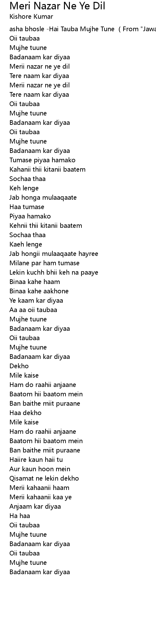 | [00:00.754] | asha bhosle -Hai Tauba Mujhe Tune (From "Jawani Diwani") |