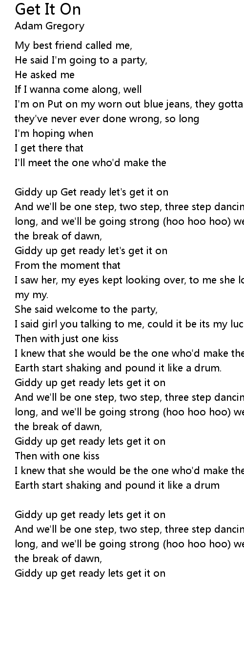 Giddy (staggered) up get ready lets get it on [Chorus] |