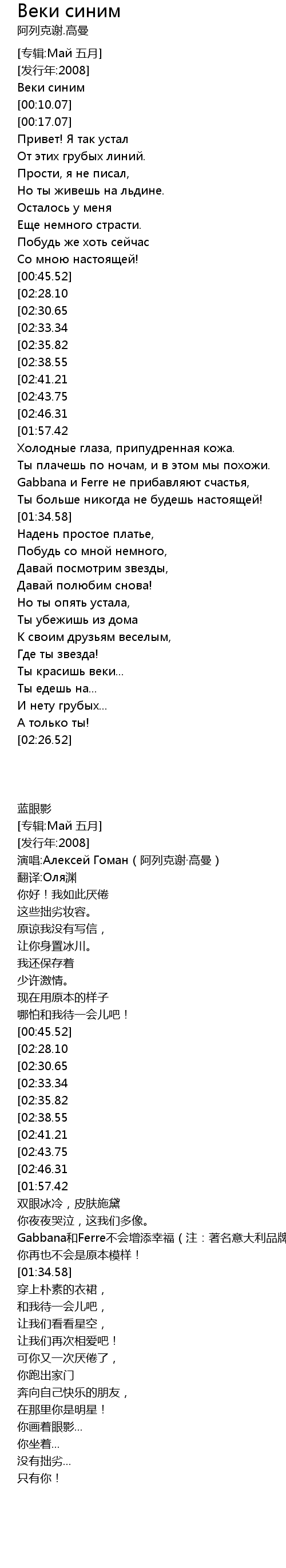 | [02:59.70][02:38.55][01:46.40][00:56.56] | Ты красишь веки синим, |