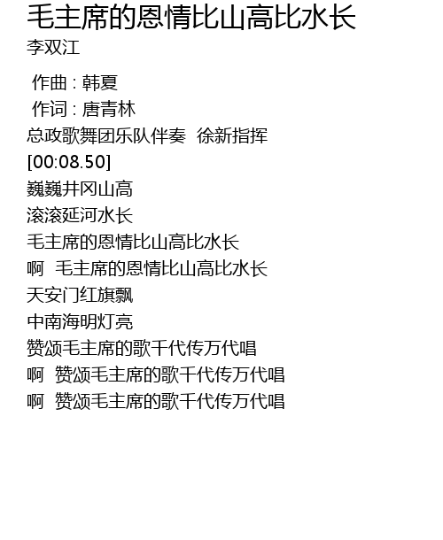 | [00:47.15] | 啊 毛主席的恩情比山高比水长 |