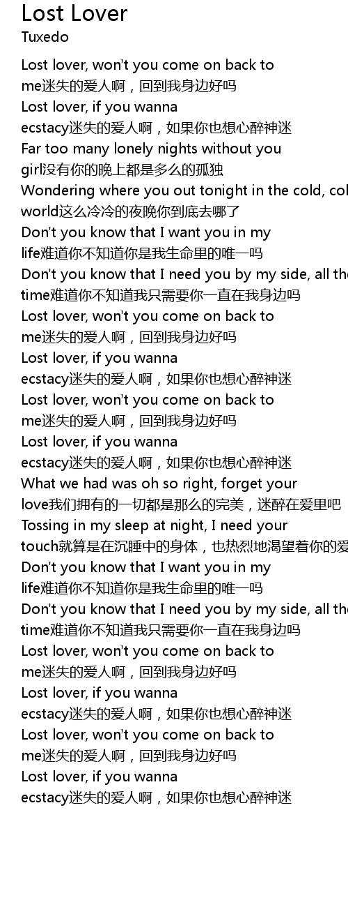 | [00:33.91] | Lost lover, won' t you come on back to me mi shi de ai ren a, hui dao wo shen bian hao ma |
