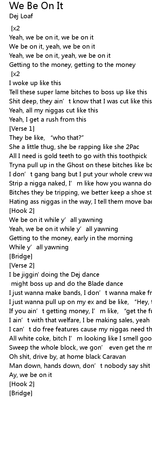 | Yeah, we be on it, yeah, we be on it | |