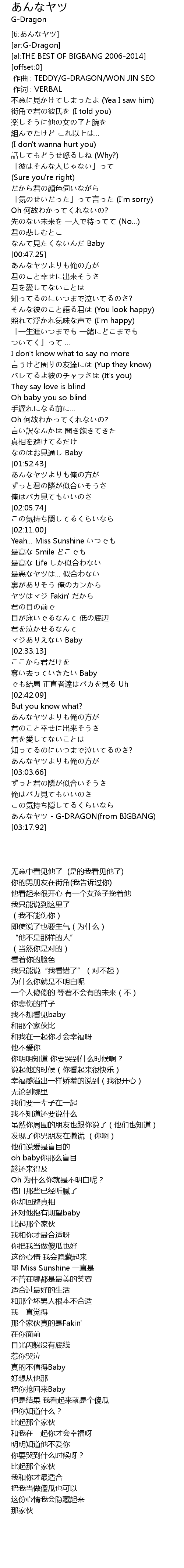 | [03:16.80] | あんなヤツ - G-DRAGON(from BIGBANG) |