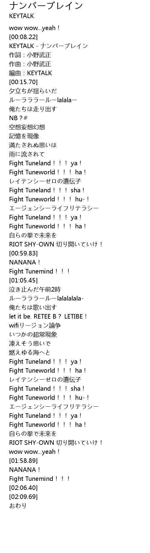 | [00:09.47] | KEYTALK - ナンバーブレイン |