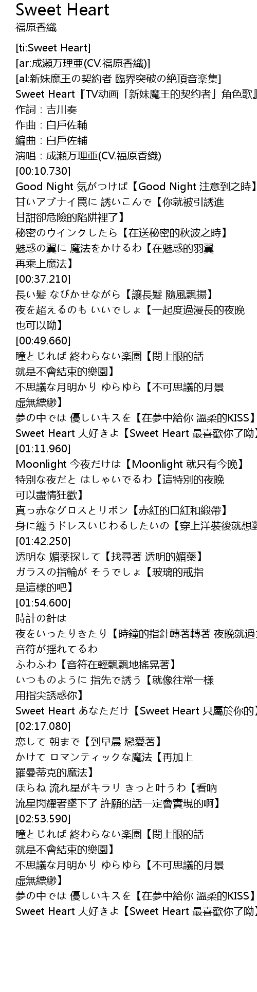 | [00:01.360] | Sweet Heart『TV动画「新妹魔王的契约者」角色歌』 |