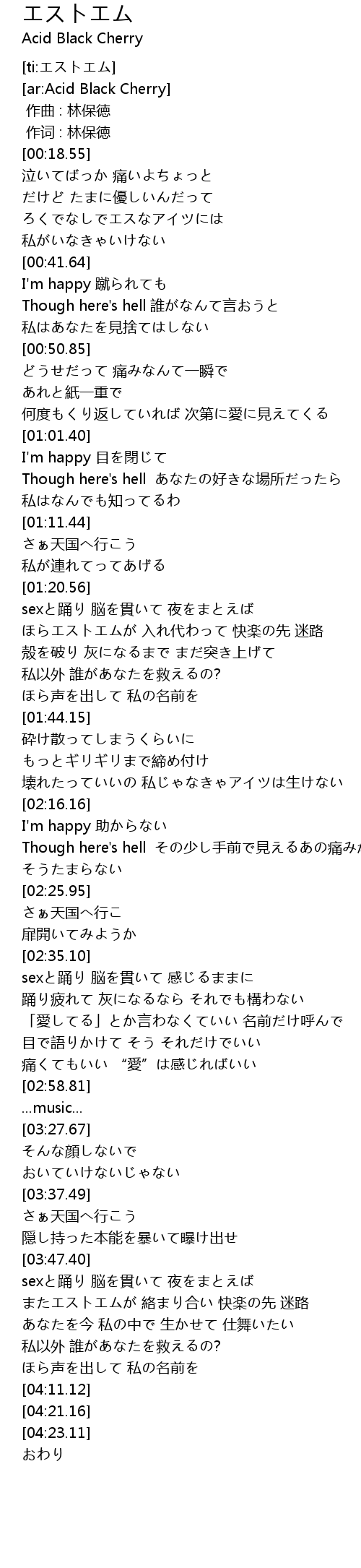 | [01:25.30] | ほらエストエムが 入れ代わって 快楽の先 迷路 |