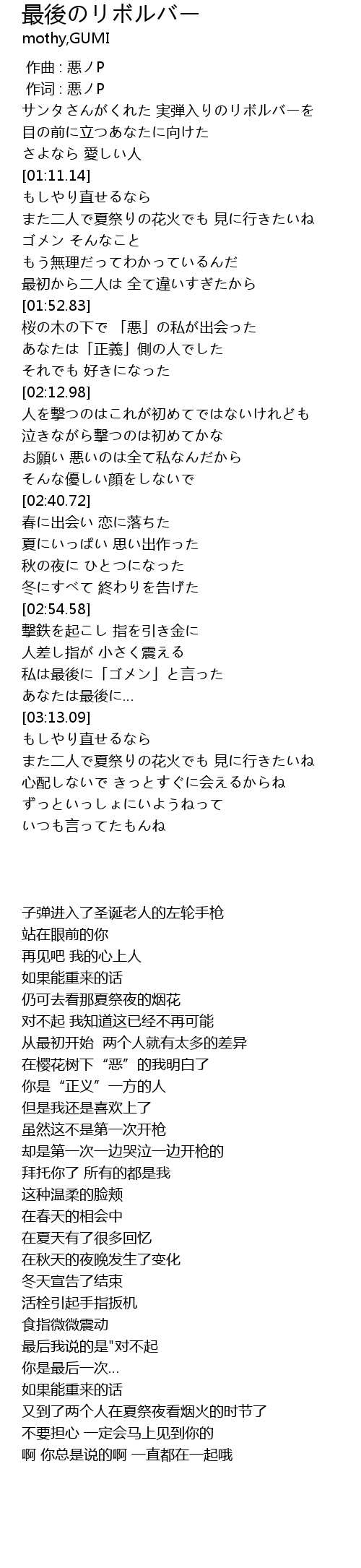 | [00:51.29] | サンタさんがくれた 実弾入りのリボルバーを |