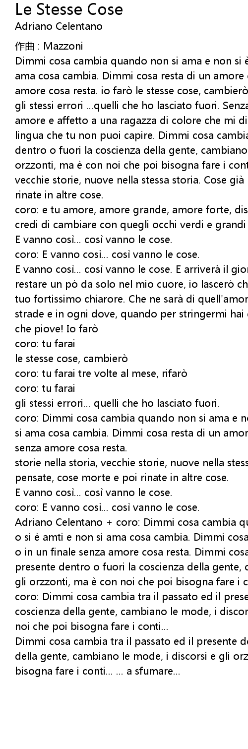 | Adriano Celentano coro: Dimmi cosa cambia quando non si ama e non si e amati, o si e amti e non si ama cosa cambia. Dimmi cosa resta di un amore che finisce, o in un finale senza amore cosa resta. Dimmi cosa cambia tra il passato ed il presente dentro o fuori la coscienza della gente, cambiano le mode, i discorsi e gli orzzonti, ma e con noi che poi bisogna fare i conti... | |