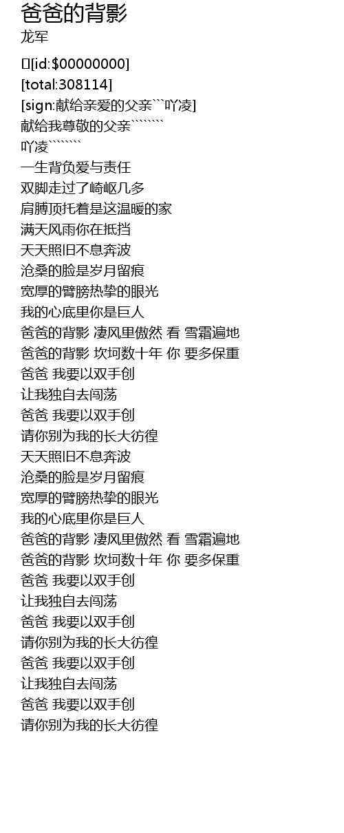 | [03:41.218] | 爸爸的背影 坎坷数十年 你 要多保重 |