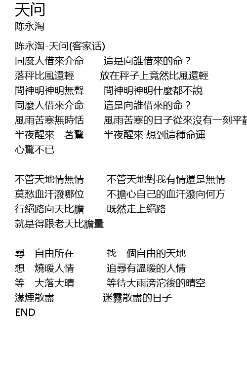 | [00:02.69] | 陈永淘-天问(客家话) |