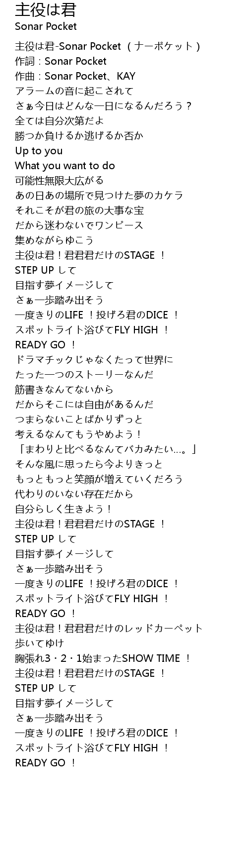 | [00:00.00] | 主役は君-Sonar Pocket (ナーポケット) |