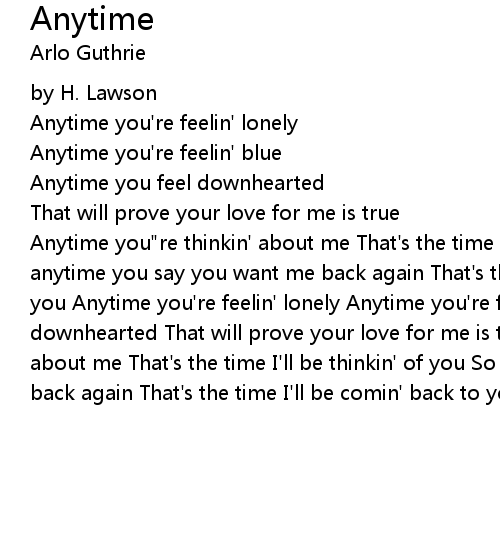 Anytime you"re thinkin' about me That's the time I'll be thinkin' of you So anytime you say you want me back again That's the time I'll come runnin' back to you Anytime you're feelin' lonely Anytime you're feelin' blue Anytime you feel downhearted That will prove your love for me is true Anytime you're thinkin' about me That's the time I'll be thinkin' of you So anytime you say you want me back again That's the time I'll be comin' back to you |