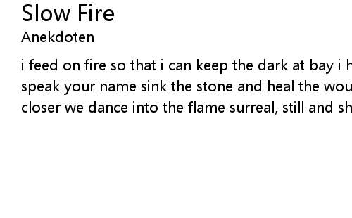 | i feed on fire so that i can keep the dark at bay i have known you i long to speak your name sink the stone and heal the wounds to make me whole again moving closer we dance into the flame surreal, still and shining come and wash me away |