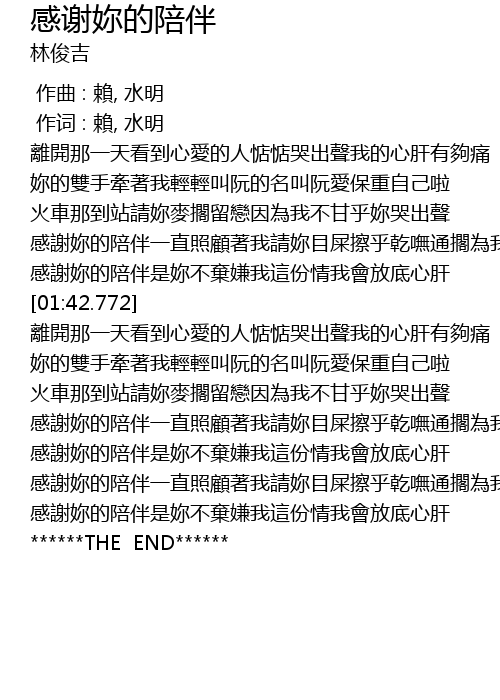 | [03:46.09] | 感謝妳的陪伴是妳不棄嫌我這份情我會放底心肝 |