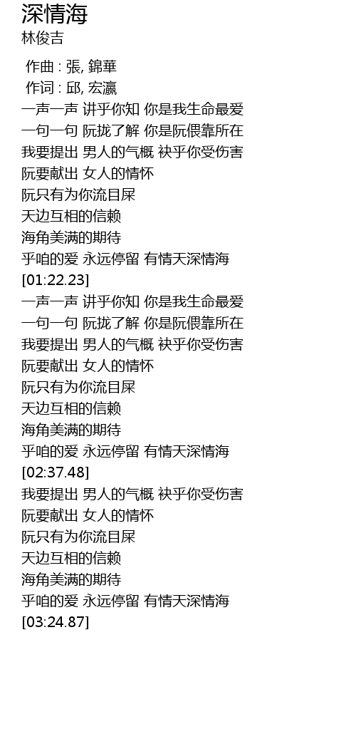 | [03:12.31] | 乎咱的爱 永远停留 有情天深情海 |