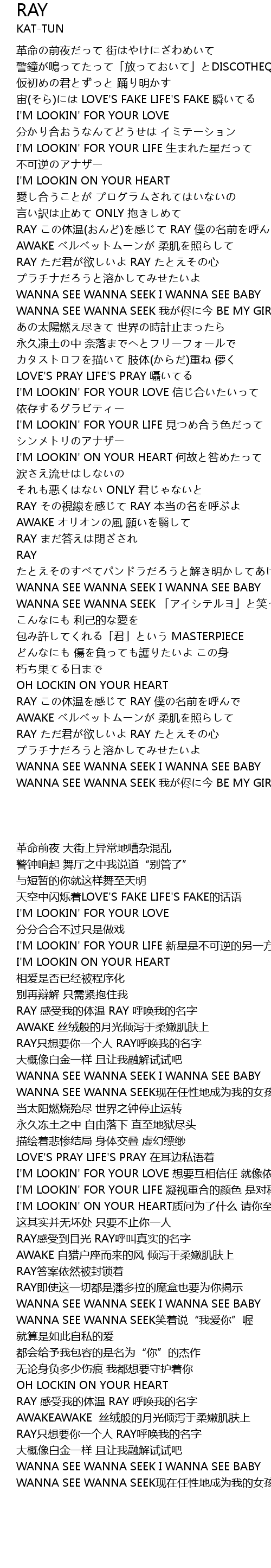 | [03:12.310] | RAY この体温を感じて RAY 僕の名前を呼んで |