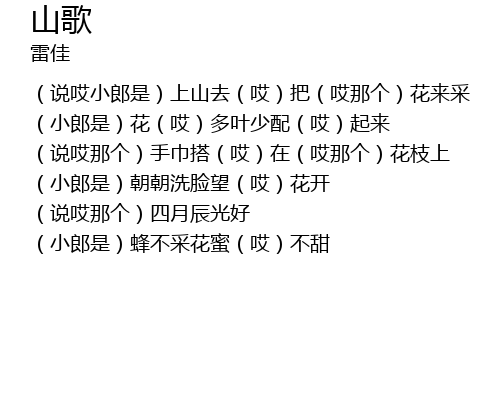 | [00:44.35] | shuō āi xiǎo láng shì shàng shān qù āi bǎ āi nà gè huā lái cǎi |
