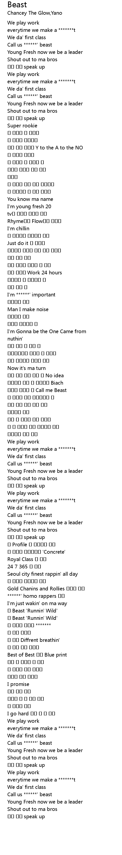 | [00:20.300] | Call us ******' beast |