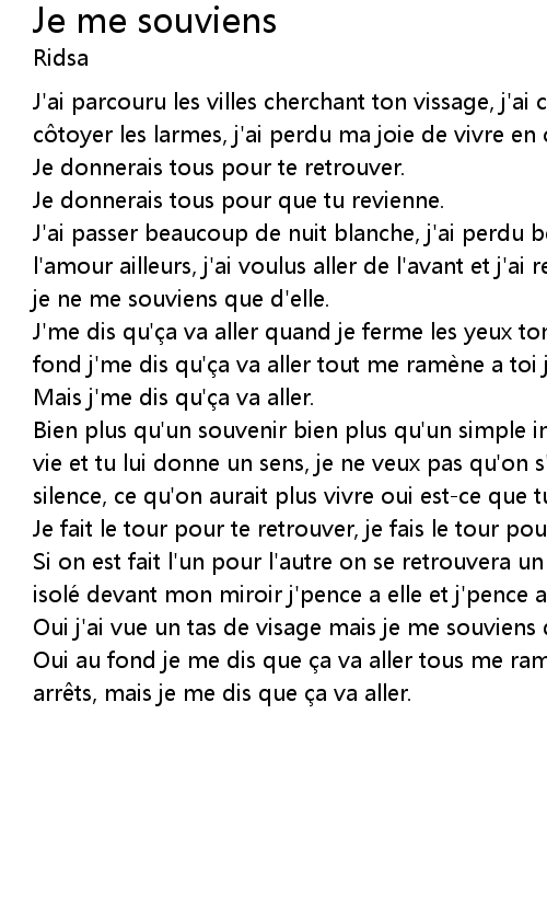 | Bien plus qu' un souvenir bien plus qu' un simple instant t' est une partie de ma vie et tu lui donne un sens, je ne veux pas qu' on s' oublie, j' y crois dans le silence, ce qu' on aurait plus vivre oui estce que tu y pense. | |