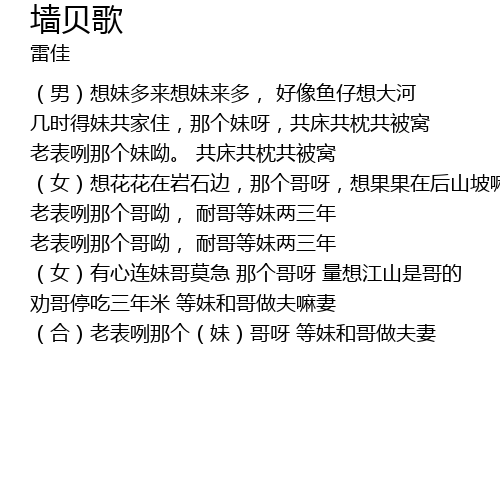 | 几时得妹共家住,那个妹呀,共床共枕共被窝 | |