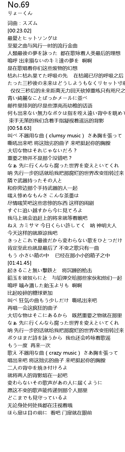 | [01:02.00] | 叫べ 不器用な曲(clumsy music) さあ胸を張って 嘶吼出来吧 将这拙劣的曲子 来吧挺起你的胸膛 |