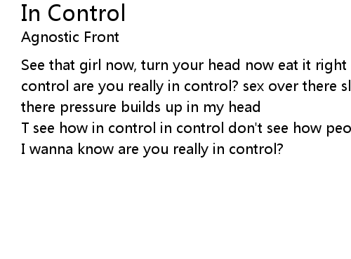 | See that girl now, turn your head now eat it right here or go now in control, in control are you really in control? sex over there sleep over there fight over there pressure builds up in my head | |