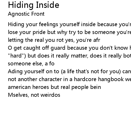 Hiding your feelings yourself inside because you're afraid to express them and lose your pride but why try to be someone you're just not why keep hiding, letting the real you rot yes, you're afr |