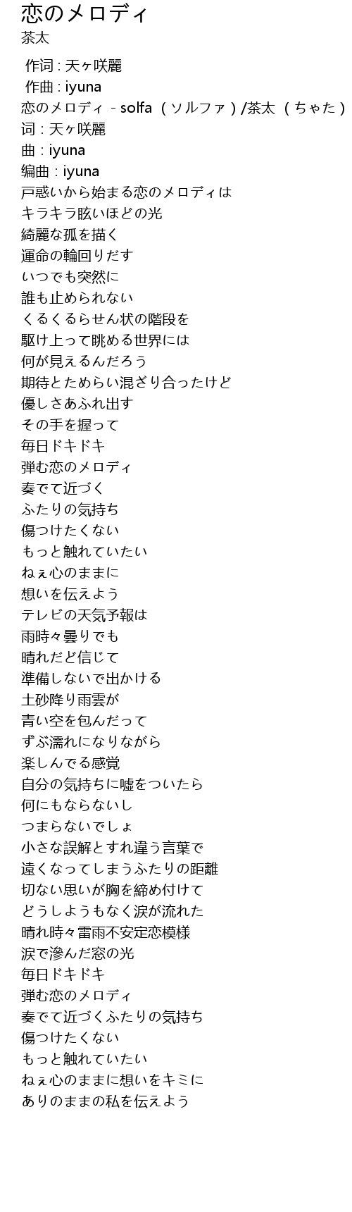 | [00:00.10] | 恋のメロディ - solfa (ソルファ)/茶太 (ちゃた) |