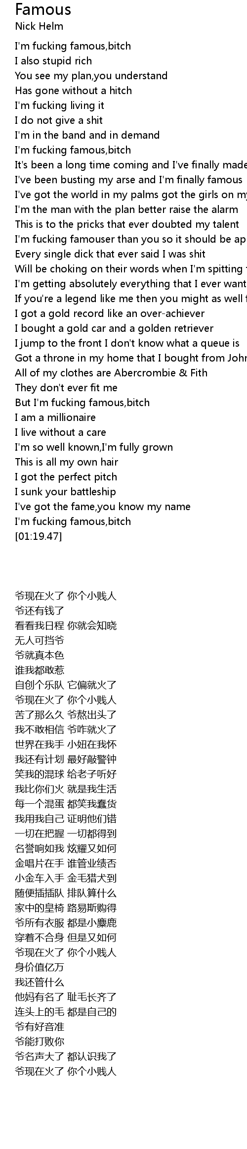 [00:18.76] I'm fucking famous,bitch