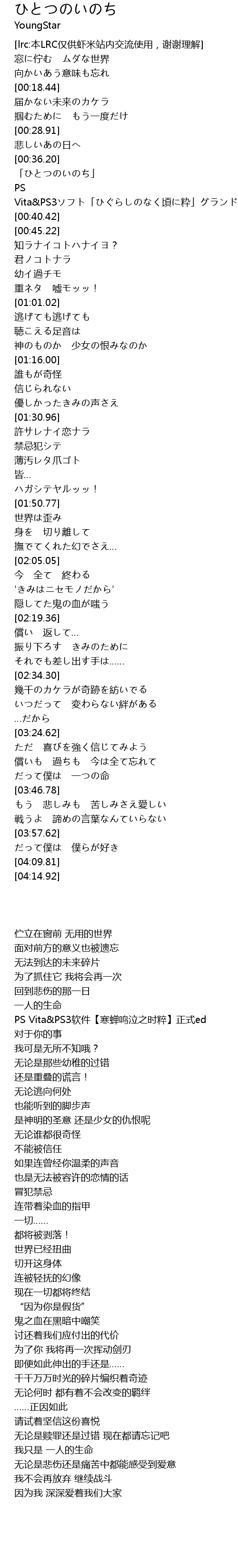 | [00:39.12] | PS Vita&PS3ソフト「ひぐらしのなく頃に粋」グランドエンディングテーマ |