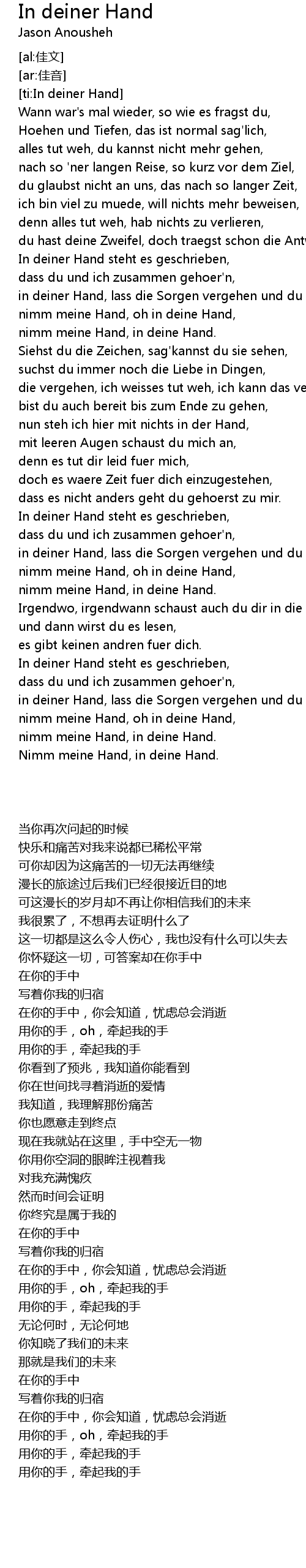| [02:30.22] | nimm meine Hand, oh in deine Hand, |