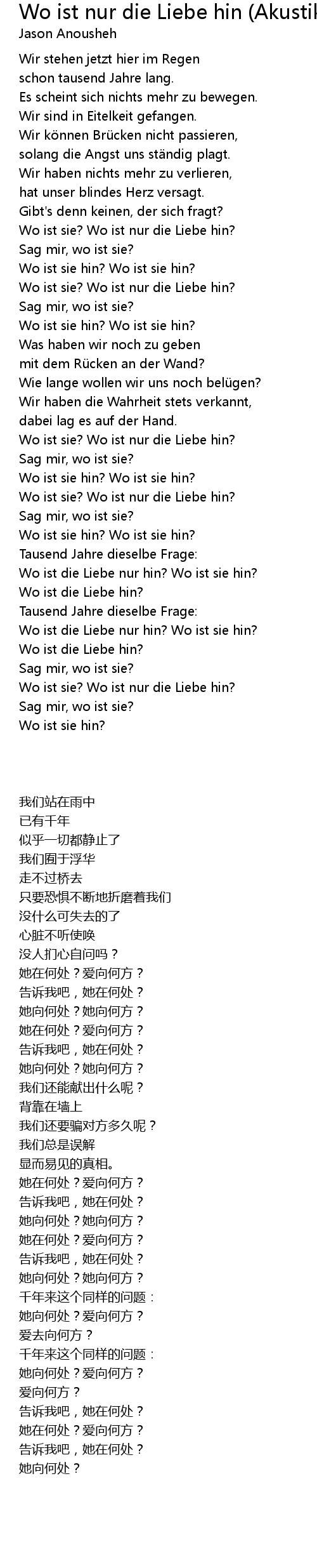 | [02:29.28] | Wo ist die Liebe nur hin? Wo ist sie hin? |