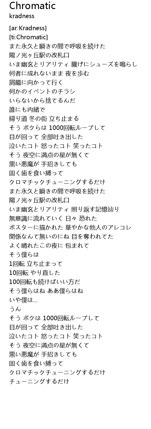 | [00:15.74] | いま幽玄とリアリティ 朧げにシューズを鳴らし |