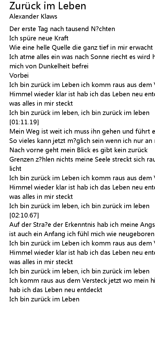 [01:42.75] Ich bin zurü ck im Leben ich komm raus aus dem Versteck jetzt wo mein Himmel wieder klar ist hab ich das Leben neu entdeckt noch rechtzeitig gecheckt was alles in mir steckt