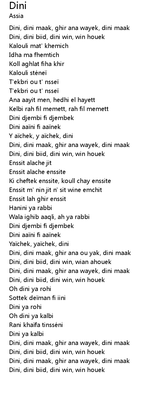 | [00:10.373] | Dini, dini maak, ghir ana wayek, dini maak |