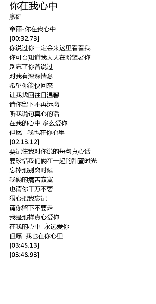 | [03:32.89] | dàn yuàn wǒ yě zài nǐ xīn lǐ |
